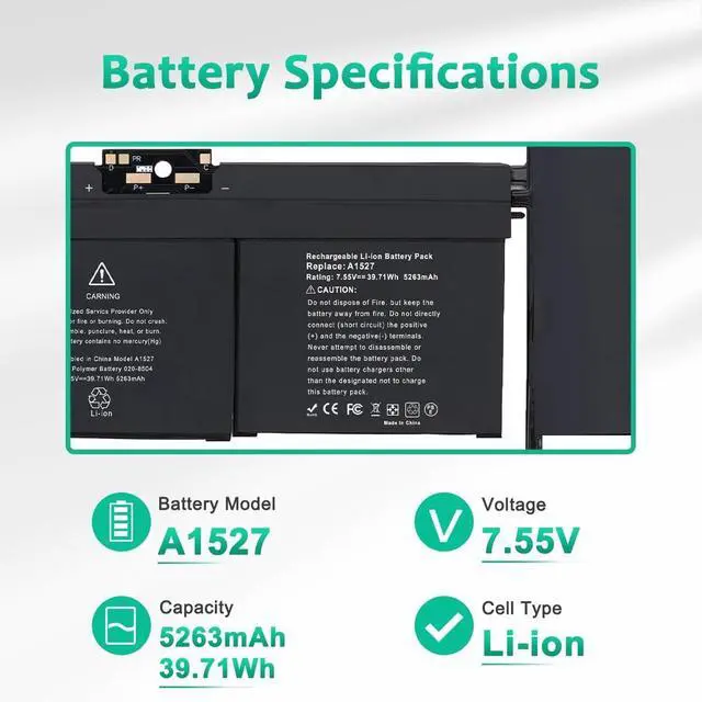 LONG-LASTING BATTERY LIFE: With 7.55V capacity (39.71Wh), the ( A1527) battery ensures all-day power for your laptops in a factory-fresh, never-used battery pack designed for maximum performance.