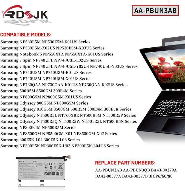 Compatible Models: For Samsung NP530E5M NP530E5M-X02US NP550XTA-K01US Series; For Samaung 7 Spin NP740U3L-L02US, 7 Spin NP740U5L, 7 Spin NP740U5L-Y03US Series; For Samsung NP740U3L NP740U3L-L02US NP740U5L-Y02US Series; For Samsung Odyssey NP800G5M 810G5M 8500GM 500R5M 300E4M 300E5K NT500R5L NT760XBE NT500R5M NT500R5P NT500R5Q NT500R5W NT501R5L NT500R5N Series; For Samsung NP8500GM NP8500GM-X01 NP8500GM-X02 Series; For Samsung NP300E4M NP500R5M Series