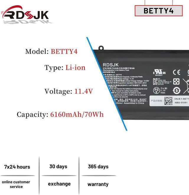 Battery type: Li-ion; Voltage: 11.4V; Capacity: 6160mAh/70Wh