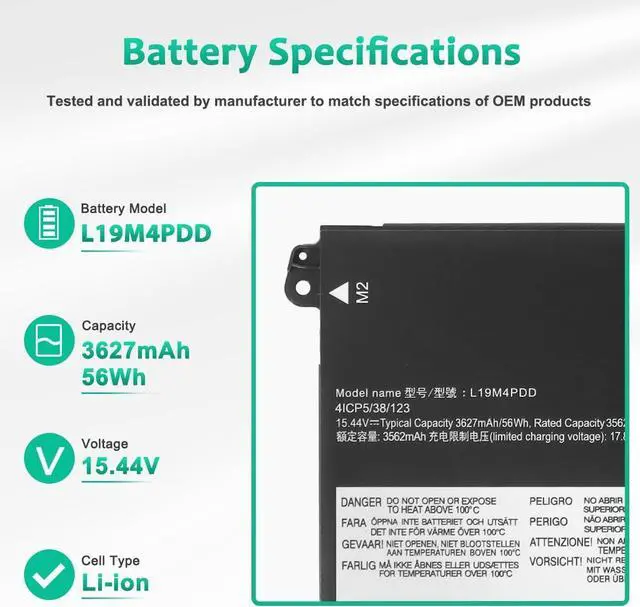 LONG-LASTING BATTERY LIFE- With 15.44V capacity ( 56Wh/3627mAh ), The ( L19M4PDD ) battery ensures all-day power for your laptops in a factory-fresh, Never-used battery pack designed for maximum performance.
