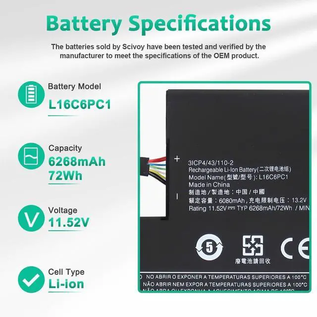 LONG-LASTING BATTERY LIFE: With 11.58V capacity ( 72Wh ), the ( L16L6PC1 ) battery ensures all-day power for your laptops in a factory-fresh, never-used battery pack designed for maximum performance.