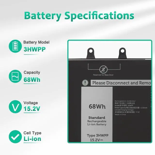 LONG-LASTING BATTERY LIFEWith 15.2V capacity ( 68Wh ), the ( 3HWPP ) battery ensures all-day power for your laptops in a factory-fresh, never-used battery pack designed for maximum performance.