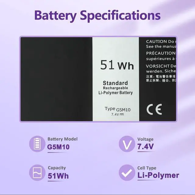 LONG-LASTING BATTERY LIFE: With 7.4V, capacity (51Wh/7000mAh/ 4-Cell), the (G5M10) battery ensures all-day power for your laptops in a factory-fresh, never-used battery pack designed for maximum performance.