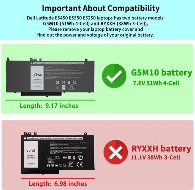 GUARANTEED FIT THESE LAPTOP MODELS: Compatible with Dell Latitude E5250 Series, Dell Latitude E5450 Series, Dell Latitude E5550 Series. Dell Latitude E5450 E5550 E5250 laptops has two battery models: G5M10 (51Wh 4-Cell) and RYXXH (38Wh 3-Cell). Please do NOT purchase the battery ONLY BY THE LAPTOP MODELS, it is not accurate. Please remove your laptop battery cover and find out the power and voltage of your original battery. Come with two Free Screwdrivers. We have concentrated on the laptop batteries production for more than twenty years. You can use our G5M10 51Wh battery for Dell Latitude E5550 E5450 E5250 safely.
