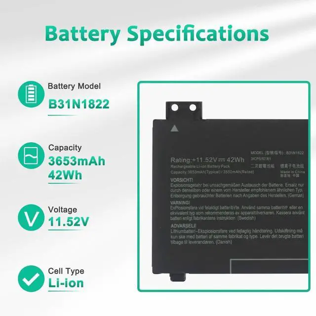 LONG-LASTING BATTERY LIFE- With 11.52V capacity (42Wh 3653mAh ), The ( B31N1822 ) battery ensures all-day power for your laptops in a factory-fresh, Never-used battery pack designed for maximum performance.