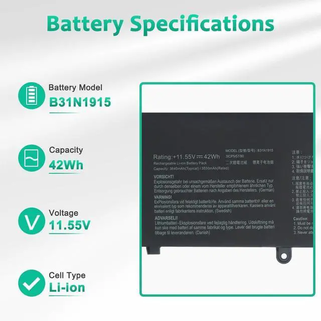 LONG-LASTING BATTERY LIFE:With 11.55V, capacity (42Wh/3640mAh), the( B31N1915) battery ensures all-day power for your laptops in a factory-fresh, never-used battery pack designed for maximum performance.