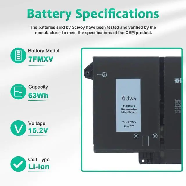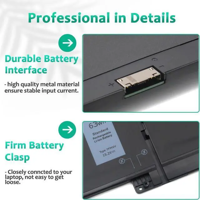 LONG-LASTING BATTERY LIFE- With 15.2V capacity ( 63Wh/3941mAh ), the ( 7FMXV ) battery ensures all-day power for your laptops in a factory-fresh, never-used battery pack designed for maximum performance.