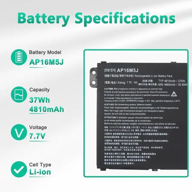 LONG-LASTING BATTERY LIFE- With 7.7V capacity ( 37Wh/ 4810mAh ), The ( AP16M5J ) battery ensures all-day power for your laptops in a factory-fresh, Never-used battery pack designed for maximum performance.