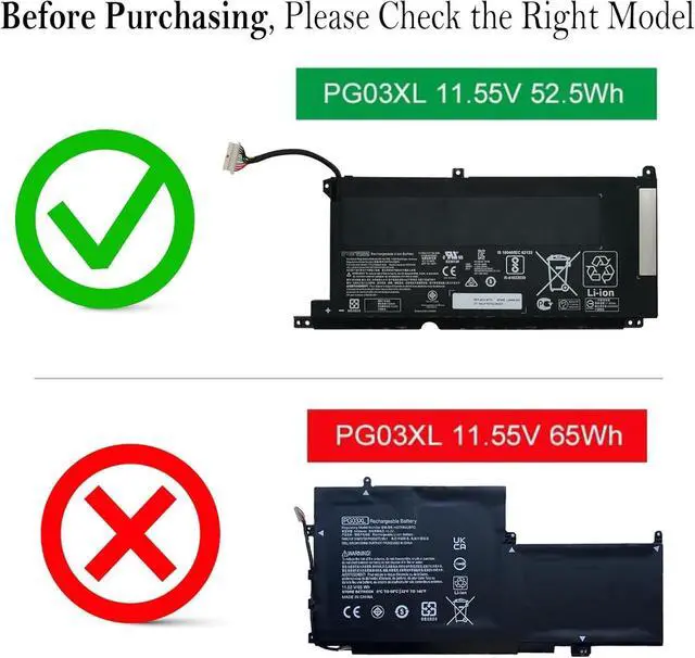 SpecificationsBattery Model: PG03XL / Voltage: 11.55V / Capacity: 52.5Wh 4323mAh 3-Cell / Color: Black / Condition: Brand New.