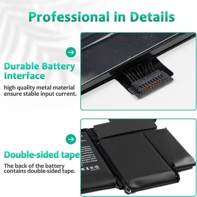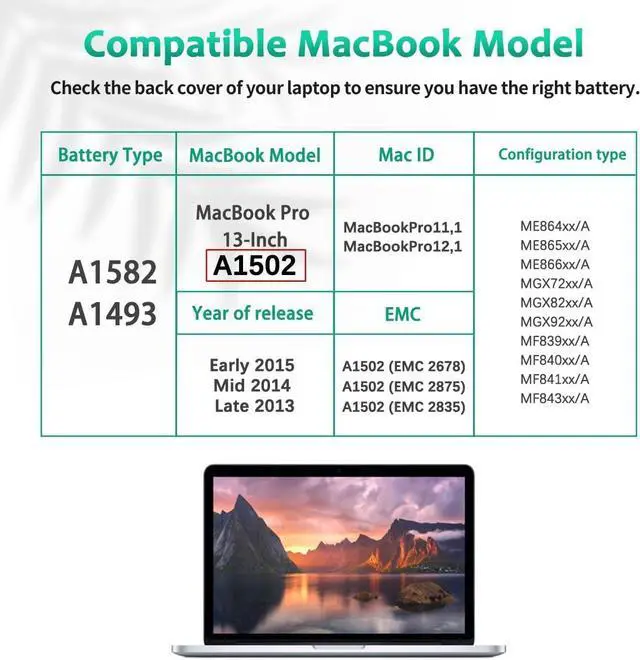 PERFECT-FIT BATTERY MODELSSupport for A1502, A1582, A1493, EMC 2678, EMC 2875, EMC 2835, MacBookPro11,1, MacBookPro12,1.