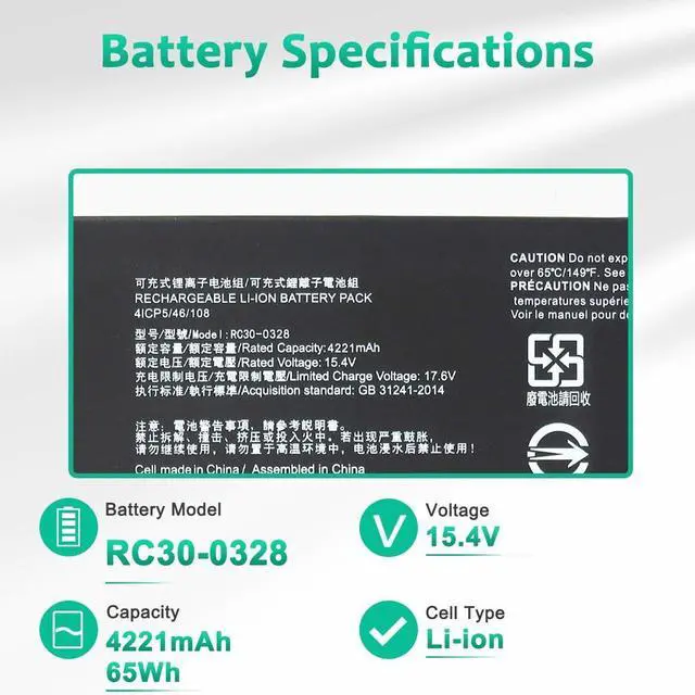 LONG-LASTING BATTERY LIFE- With 15.4V capacity ( 65Wh/4221mAh ), The ( RC30-0328 ) battery ensures all-day power for your laptops in a factory-fresh, never-used battery pack designed for maximum performance.