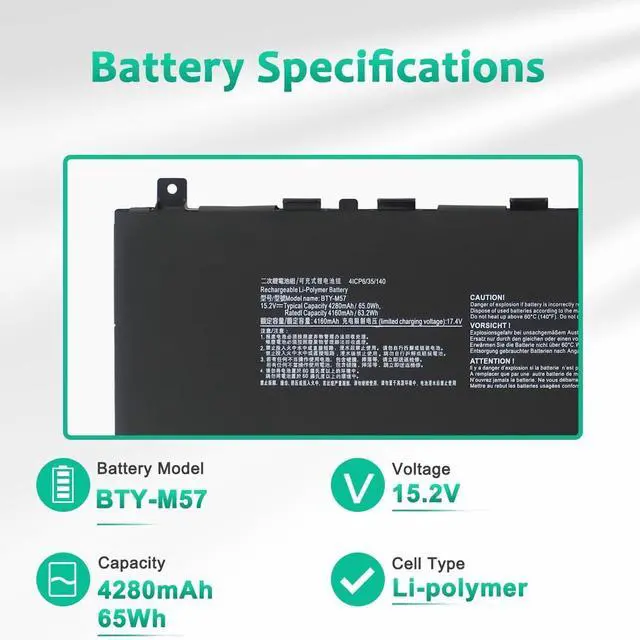 LONG-LASTING BATTERY LIFE- With 15.2V capacity ( 65Wh/4280mAh ), The ( BTY-M57 ) battery ensures all-day power for your laptops in a factory-fresh, Never-used battery pack designed for maximum performance.