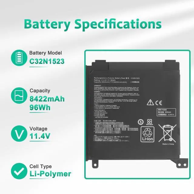 • LONG-LASTING BATTERY LIFE: With 11.4V capacity ( 96Wh/8422mAh/6-cell ), The ( C32N1523 ) battery ensures all-day power for your laptops in a factory-fresh, Never-used battery pack designed for maximum performance.