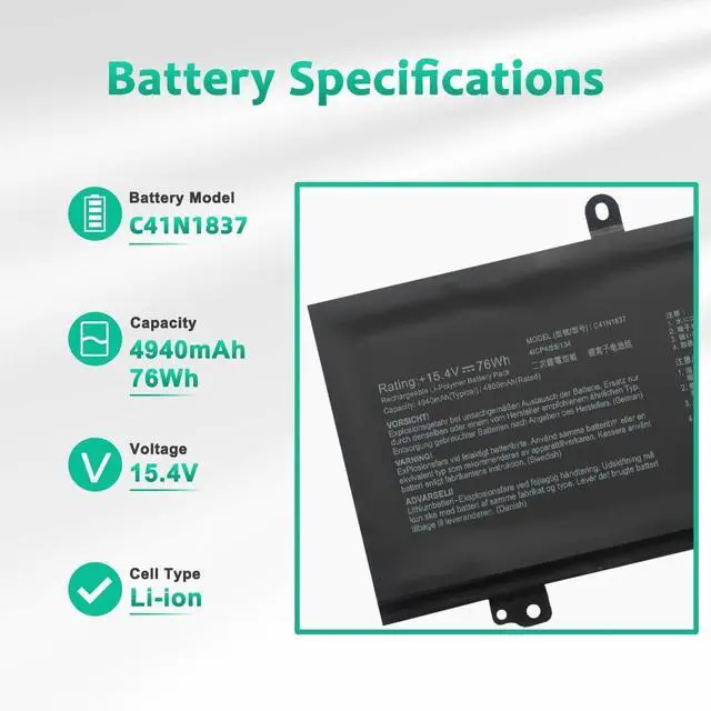 LONG-LASTING BATTERY LIFE- With 15.4V capacity ( 76Wh/4940mAh ), The ( C41N1837 ) battery ensures all-day power for your laptops in a factory-fresh, Never-used battery pack designed for maximum performance.