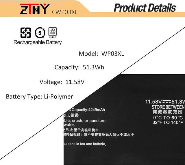 Specifications: Battery type: Li-Polymer. Color: Black. Voltage:11.58V. Capacity: 51.3Wh. ZTHY specializes in Laptop and camera Accessories including Laptop Batteries, Tablet batteries, Camera Batteries, Camcorder Batteries, Vacuum Batteries, and chargers