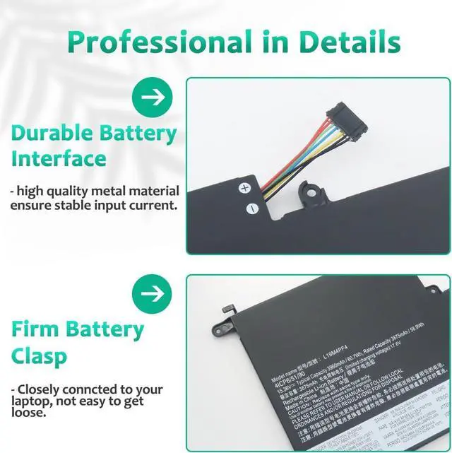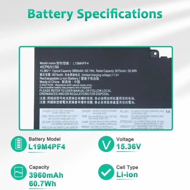 LONG-LASTING BATTERY LIFE- With 15.36V capacity ( 60.7Wh/ 3960mAh/ 4-Cell ), The ( L19D4PF4 ) battery ensures all-day power for your laptops in a factory-fresh, Never-used battery pack designed for maximum performance.