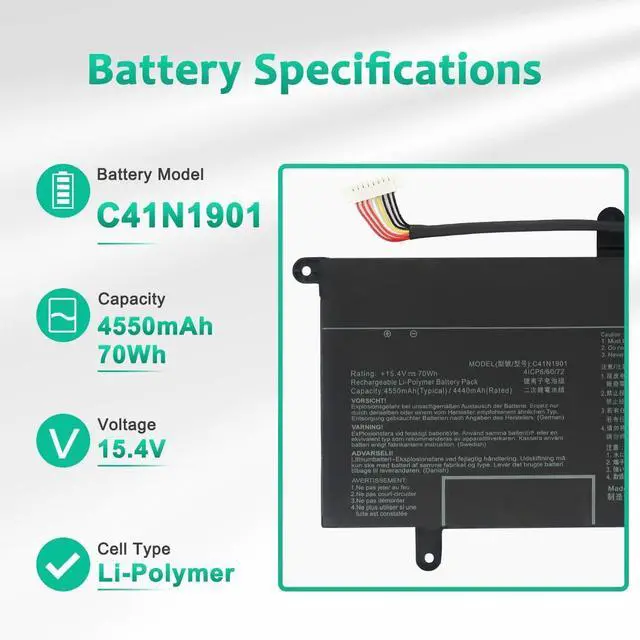 LONG-LASTING BATTERY LIFE:With 15.4V, capacity (70Wh/4550mAh), the( C41N1901 ) battery ensures all-day power for your laptops in a factory-fresh, never-used battery pack designed for maximum performance.