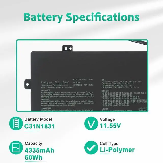 LONG-LASTING BATTERY LIFE- With 11.55V capacity ( 50Wh/4210mAh ), The ( C31N1831 ) battery ensures all-day power for your laptops in a factory-fresh, Never-used battery pack designed for maximum performance.