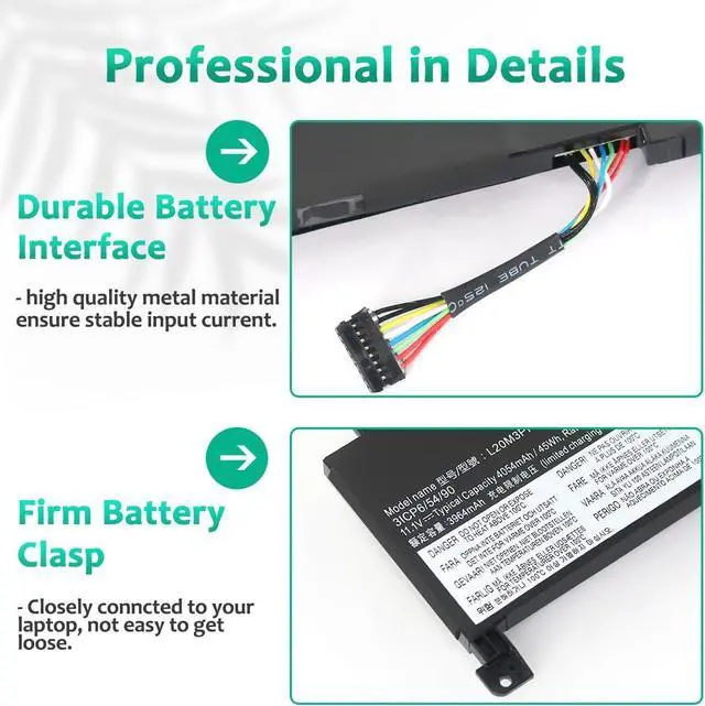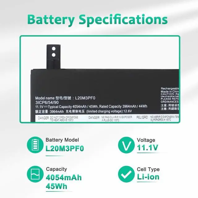 LONG-LASTING BATTERY LIFE:With 11.1V,capacity (45Wh/4054mAh/3-Cell),the(L20C3PF0) battery ensures all-day power for your laptops in a factory-fresh, never-used battery pack designed for maximum performance.