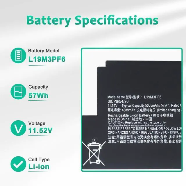 LONG-LASTING BATTERY LIFE:With 11.52V,capacity (57Wh/5005mAh),the( L19M3PF6) battery ensures all-day power for your laptops in a factory-fresh, never-used battery pack designed for maximum performance.