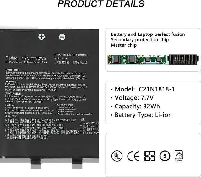 C21N1818-1 Batería de Repuesto para computadora portátil Compatible for Asus VivoBook 15 F512FA F512DA-SH31 X512FA X512FB X512UF-BQ135T X512FA-BQ064T 0B200-03190800 2ICP7/54/83 7.7V 32Wh