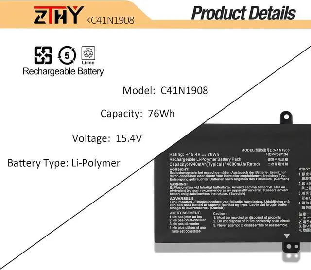 Compatible Part NumberC41N1908 C41PQ05 0B200-03610000 0B200-03610100 0B200-03610200 4ICP4/59/134Compatible ModelReplacement for Asus ROG Zephyrus G14 GA401II GA401I GA401Q Series: G14 GA401II-R55TA8G, G14 GA401II-HE109T, G14 GA401II-HE148T, G14 GA401II-HE111TS, G14 GA401II-HE046T, G14 GA401II-BM131TS, G14 GA401II-HE095T, G14 GA401II-HE152T, G14 GA401II-BM027T, G14 GA401II-HE105T, G14 GA401II-HE169TS, G14 GA401II-HE048T, G14 GA401II-BM210, G14 GA401II-GTX1650Ti, G14 GA401II-BM026T, G14 GA401II-HE025T, G14 GA401II-HE003T, G14 GA401II-HE022TS, G14 GA401II-HE058T, G14 GA401II-HE082T, G14 GA401II-BM202TCompatible ModelReplacement for Asus Zephyrus G14 GA401IV GA401IVC Series: ROG Zephyrus G14 GA401IV-HA120T, G14 GA401IV-HA116T, G14 GA401IV-HA037, G14 GA401IV-HE316T, G14 GA401IV-HA026T, G14 GA401IV-HE186T, G14 GA401IV-HE245T, G14 GA401IV-HA162T, G14 GA401IV-HE247T, G14 GA401IV-HE339T, G14 GA401IV-HA026T, G14 GA401IV-HA112R, G14 GA401IV-HA033T, G14 GA401IV-HA304R, G14 GA401IV-BR9N6, G14 GA401IV-HA188T, G14 GA401IV-HA127T, G14 GA401IV-HA134T, G14 GA401IV-HE234T, G14 GA401IV-HE003T, G14 GA401IV-HE121TCompatible ModelG14 GA401IV-HA027R, G14 GA401IV-HA033, G14 GA401IV-HA112TS, G14 GA401IV-HE022, G14 GA401IV-HE259T, G14 GA401IV-HA274T, G14 GA401IV-HA168T, G14 GA401IV-HE342T, G14 GA401IV-HA108T, G14 GA401IV-DS91, G14 GA401IV-XS96, G14 GA401IV-HA037T, G14 GA401IV-HA116T, G14 GA401IV, G14 GA401IV-HE135TCompatible ModelReplacement for Asus Zephyrus G14 GA401IV GA401IVC Series: ROG Zephyrus G14 GA401IH-BM007, G14 GA401IH-HE004T, G14 GA401IH-BM057TCompatible ModelReplacement for Asus ROG Zephyrus G14 GA401IU GA401IHR Series: ROG Zephyrus G14 GA401IU-HE141TS, G14 GA401IU-HE017R, G14 GA401IU-HE172T, G14 GA401IU-HE045T, G14 GA401IU-HE017T, G14 GA401IU-HE139TS, G14 GA401IU-HE092T, G14 GA401IU-HE092TS, G14 GA401IU-BS76, G14 GA401IU-HE173TS, G14 GA401IU-BM201T, G14 GA401IU-HE021T, G14 GA401IU-BM073T, G14 GA401IU-HE163T, G14 GA401IU-HE001T, G14 GA401IU-HA032R, G14 GA401IU-HE162T, G14 GA401IU-HE157T, G14 GA401IU-HA032TCompatible ModelReplacement for ASUS ROG Zephyrus G14 GA401QC GA401QH GA401QM GA401QE GA401QEC Series;Compatible ModelReplacement for ASUS ROG Studio Pro 14 PX401QM PX401IV Series.Important AttentionIf you install the battery, you find that the laptop cannot detect the battery or the battery level cannot be displayed normally. Please check whether the battery cable is installed properly. Sometimes the battery cannot be charged because the cable is not fixed properly. What do I need to be aware of when I receive a battery?