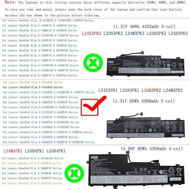 Compatible with Machine Modelsfor Lenovo IdeaPad Slim 5-16ARP10 (Type: 83HU) Series; for Lenovo IdeaPad Slim 5-16AKP10 (Type: 83HY) Series; for Lenovo IdeaPad Slim 5-16AHP10 (Type: 83HW) Series; for Lenovo IdeaPad Slim 5-16IRH10R (Type: 83J1) Series; for Lenovo IdeaPad Slim 5-14IMH10 (Type: 83V6) Series(Note: This battery is only compatible with IdeaPad Slim series (not compatible with IdeaPad Pro series). The laptops in this listing contain three different capacity batteries (50Wh, 60Wh, and 80Wh). To save you time and money, please open the back cover of the laptop and confirm that your battery matches the one shown in the picture before ordering.)