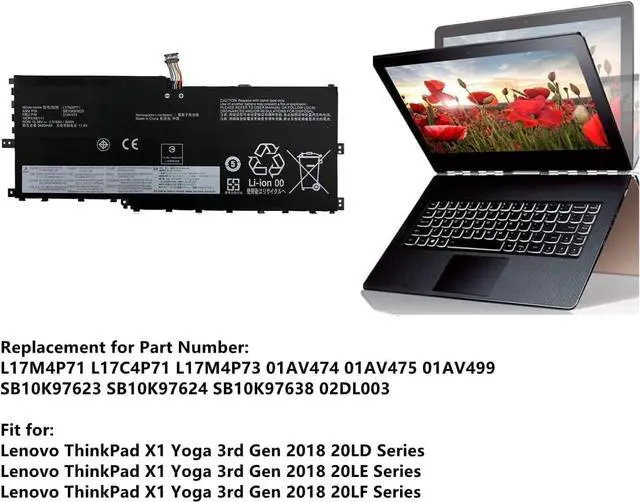L17M4P71 01AV474 Bateria para portátil Compatible con ThinkPad X1 Yoga 3rd Gen 2018 Series L17C4P71 01AV475 SB10K97624 SB10K97623 L17M4P73 SB10K97638 01AV499 02DL003 15.36V 54Wh
