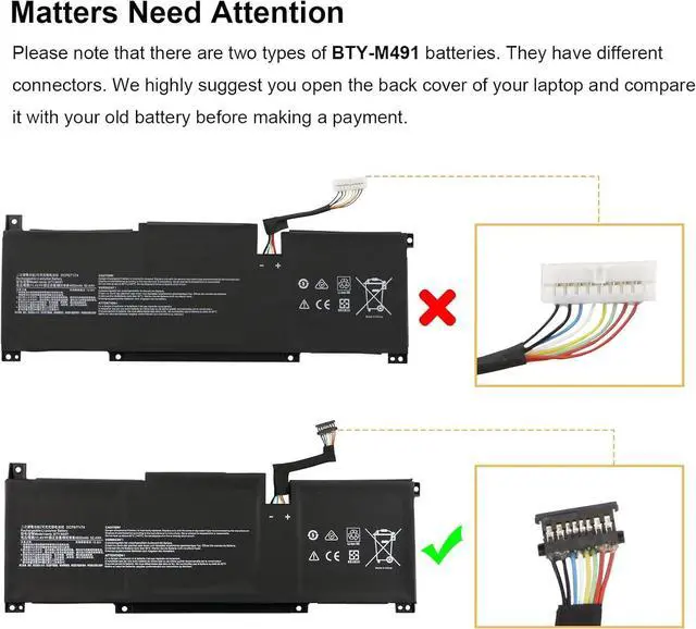 Matters Need Attention: Please note that there are two types of BTY-M491 batteries. They have different con-nectors. We highly suggest you open the back cover of your laptop and compare itwith your old battery before making a payment