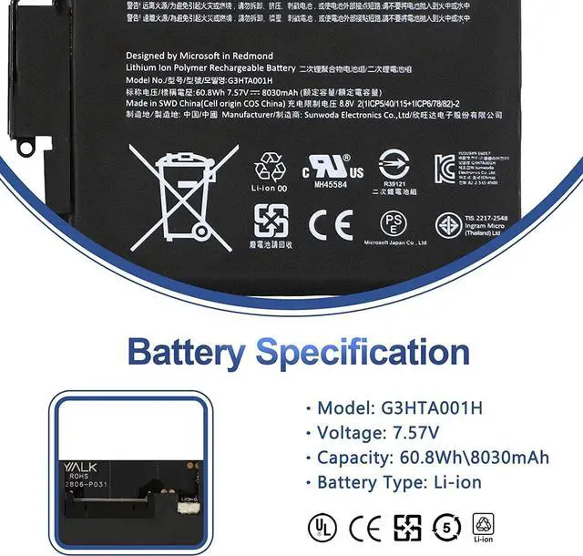 60.8Wh 7.57V G3HTA001H Batería para portátil Compatível com Microsoft Surface Book 1 1st Gen 1785 with Performance Base (GTX 965M) 93HTA001H Installation Tools 7.57V 8030mAh