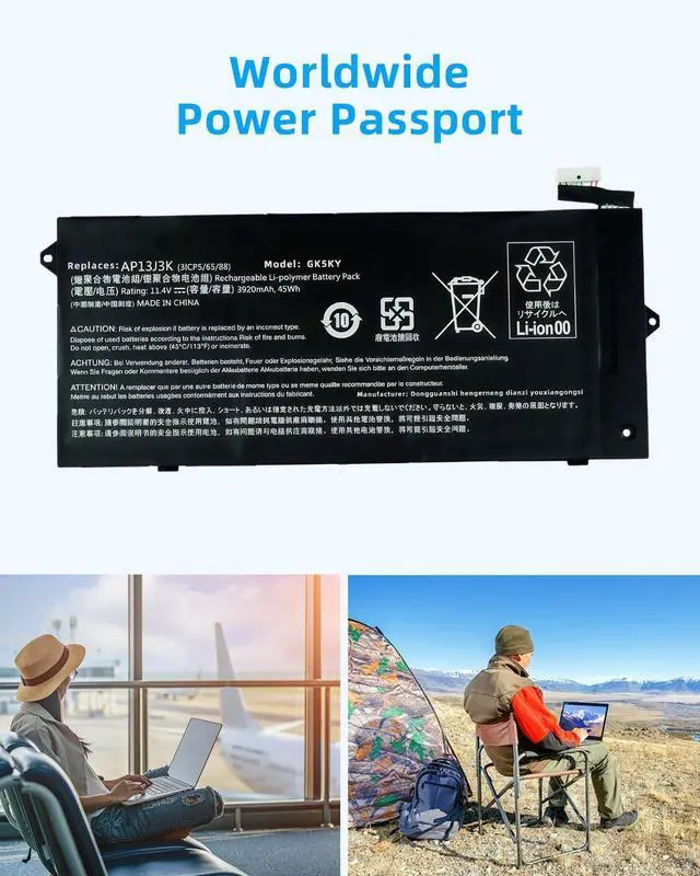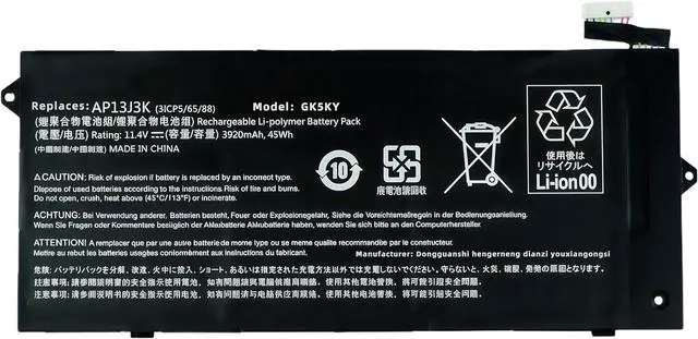 SPECIFICATION : Model Name:AP13J3K Voltage: 11.4V ; Capacity: 45Wh/3920mAh .Grade A cells ensure fast charges and low power consumption; Built-in circuit protection ensures both safety and stability. Condition: 100% New; Battery life: More than 1000 cycles.