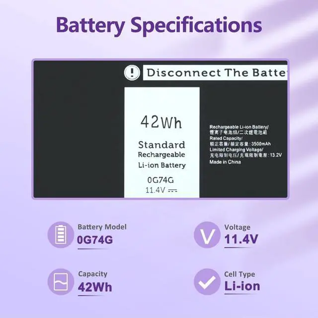 LONG-LASTING BATTERY LIFE: With 11.4Vcapacity (42Wh/3500mAh), the (0G74G) battery ensures all-day power for your laptops in a factory-fresh, never-used battery pack designed for maximum performance.