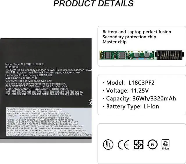 L18C3PF2 Batería de Repuesto para computadora portátil Compatible for IdeaPad L340-15API Touch L340-15IWL L340-17API L340-17IWL V155-15API L18D3PF1 L18L3PF1 L18M3PF2 11.25V 36Wh 3320mAh 3-Cell
