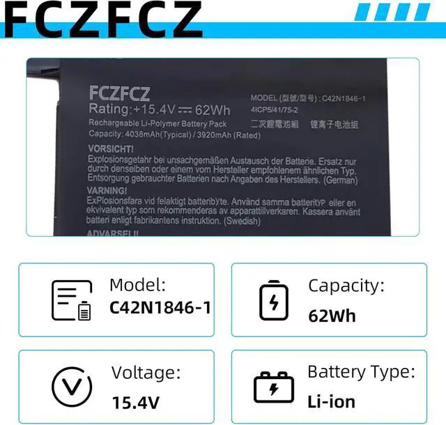 SpecificationsBattery Model: C42N1846-1 // Voltage:15.4V // Capacity:62Wh 4038mAh // Color:Black // Condition:Brand New.