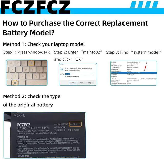 InstructionsPlease open the back cover of the laptop before purchasing and confirm that the original battery type is the same as the picture. Please read the battery instruction manual carefully before installing the battery. Please install the battery correctly and ensure that the battery interface and the motherboard are firmly connected. Please use the original charger to charge the laptop. After battery installation, discharge the new battery to 5% (not 0%), then charge and cycle 3-4 times to wake up the new battery.
