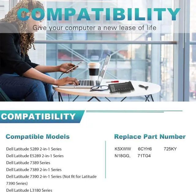60Wh K5XWW 7.6V Batería de Repuesto para computadora portátil Compatible for Dell Latitude 5289 7389 7390 E5289 2-in-1 L3180 P29S 71TG4 J0PGR N18GG P29S001 P29S002 6CYH6 725KY 451-BBZC 4-Cell