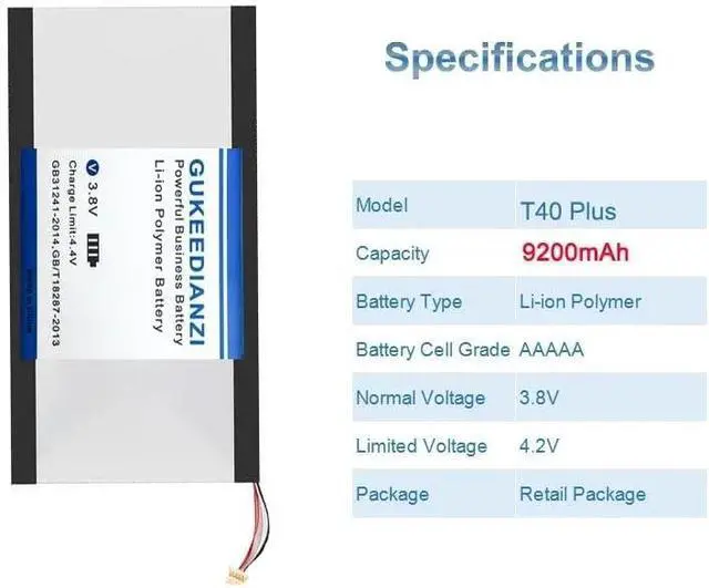 Compatible Models This is an independent lithium polymer battery that is not sold with the product. Battery Model: T40 Plus. This Replacement battery Compatible for Teclast T40 Plus/T40 Pro Tablet PC Battery 5 Wire Plug. Before purchasing, please ensure that it matches your device model.