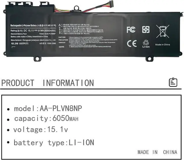 15.1V 91Wh AA-PLVN8NP Batería de Repuesto para computadora portátil Compatible for Samsung ATIV Book 8 Touch 780Z5E 880Z5E NP770Z5E NP780Z5E NP880Z5E NP880Z5E-X01AU NP880Z5E-X01NL NP880Z5E-X01SE
