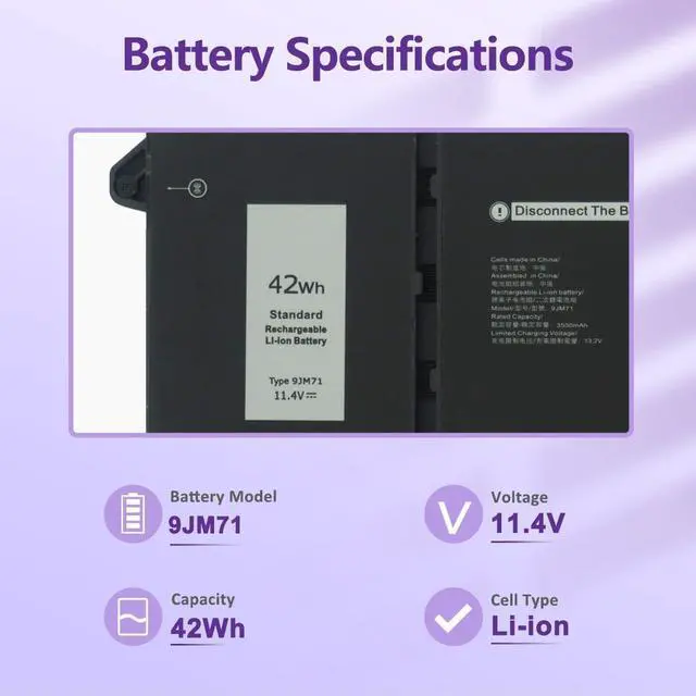 LONG-LASTING BATTERY LIFE- With 11.4Vcapacity (42Wh/3500mAh), the ( 9JM71 ) battery ensures all-day power for your laptops in a factory-fresh, never-used battery pack designed for maximum performance.