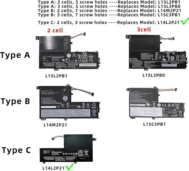 COMPATIBLE P/N: L14L2P21 5B10Q39203 5B10Q39204 L14L2P21 5B10Q39206 5B10W67199 L15M3PB0 5B10Q39202 L15L3PB0 5B10Q39201 L15C3PB1 5B10Q39205 2ICP6/54/90 2ICP6/55/90. This battery has three different shapes, plz make sure the one you ordered is totally same with yours. Thanks.