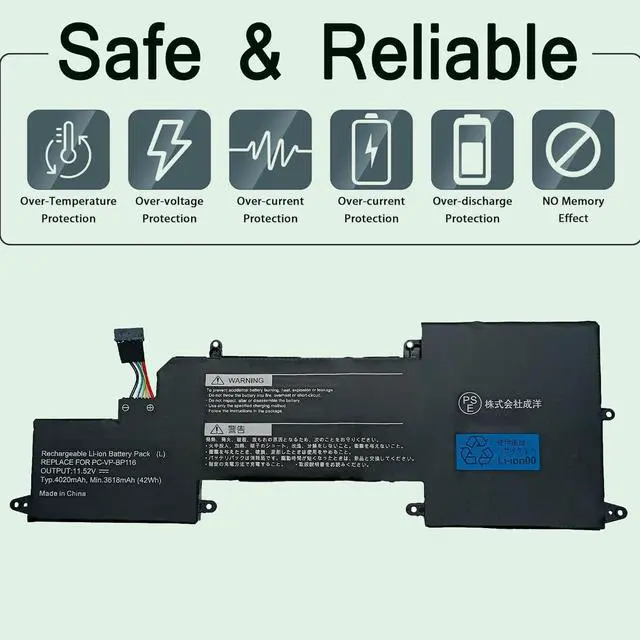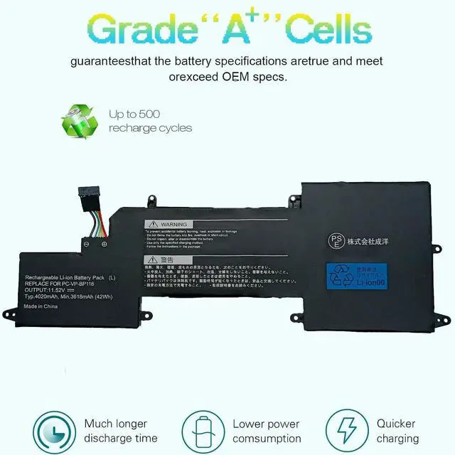 High precision compatible design genuine battery compatible (compatible with PC-VP-BP115/116) compliant with panasonic genuine specifications: Voltage 11.52v ± 0.05v, capacity 42wh / 4020mah built-in overcharge/overdischarge prevention IC chip protects notebook PC board