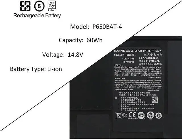 P650BAT-4 Batería de Repuesto para computadora portátil Compatible for Clevo P650SA P650SE P650SG P651SA P651SG P655SE P655RE6 P671RA P671RG P671RE3 Z7 Z7M Z8 SNP8651 NP8650 NP8652 60Wh 14.8V