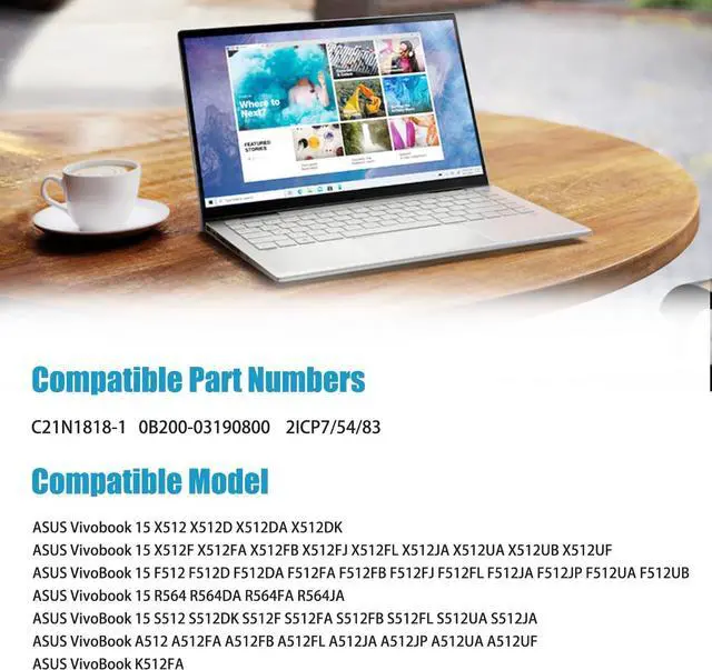 GUARANTEED FIT THESE LAPTOP MODELS: Compatible with ASUS Vivobook 15 X512D X512DA X512DK, ASUS Vivobook X512F X512FA X512FB X512FJ X512FL, ASUS Vivobook X512J X512JA X512JAU X512JF X512JP X512UB X512UA X512UF; VivoBook 15 F512D F512DA, VivoBook 15 F512F F512FA F512FB F512FJ F512FL F512FL-BQ076T F512JA F512JA-AS34, VivoBook 15 F512J F512JP F512UA F512UB; VivoBook 15 R564DA R564FA R564JA R564JA-UH51T; VivoBook 15 S512DK S512FA S512FB S512FL S512UA S512JA; VivoBook A512FA A512FB A512FL A512JA A512UF A512JP A512UA K512FA.