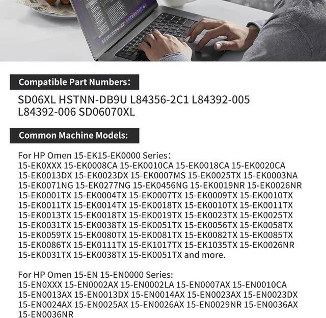 Perfect Compatibility laptop battery:For HP Omen 15-EK15-EK0000 Series 15-EK0XXX 15-EK0008CA 15-EK0010CA 15-EK0018CA 15-EK0020CA 15-EK0013DX 15-EK0023DX 15-EK0007MS 15-EK0025TX 15-EK0003NA 15-EK0071NG 15-EK0277NG 15-EK0456NG 15-EK0019NR 15-EK0026NR 15-EK0001TX 15-EK0004TX 15-EK0007TX 15-EK0009TX 15-EK0010TX 15-EK0011TX 15-EK0014TX 15-EK0018TX 15-EK0010TX 15-EK0011TX 15-EK0031TX 15-EK0038TX 15-EK0051TX and more. For HP Omen 15-EN 15-EN0000 Series: 15-EN0XXX 15-EN0002AX 15-EN0002LA 15-EN0007AX 15-EN0010CA 15-EN0013AX 15-EN0013DX 15-EN0014AX 15-EN0023AX 15-EN0023DX 15-EN0024AX 15-EN0025AX 15-EN0026AX 15-EN0029NR 15-EN0036AX TPN-Q236 TPN-Q238.