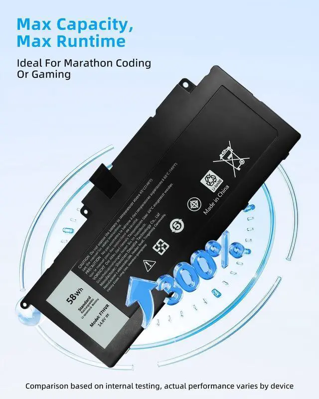 SPECIFICATION : Model Name: F7HVR Capacity: 58Wh; Voltage: 14.8V; Grade A cells ensure fast charges and low power consumption; Built-in circuit protection ensures both safety and stability. Condition: 100% New; Battery life: More than 1000 cycles.