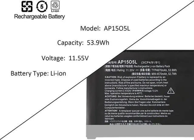 AP15O5L Batería de Repuesto para computadora portátil Compatible for Acer S13 S5-371 R13 CB5-312T 1 SF114-32 5 SF514-51 SF515-51T 700 PT715-51 5 SP513-52N SP513-52NP AP1505L 53.9Wh
