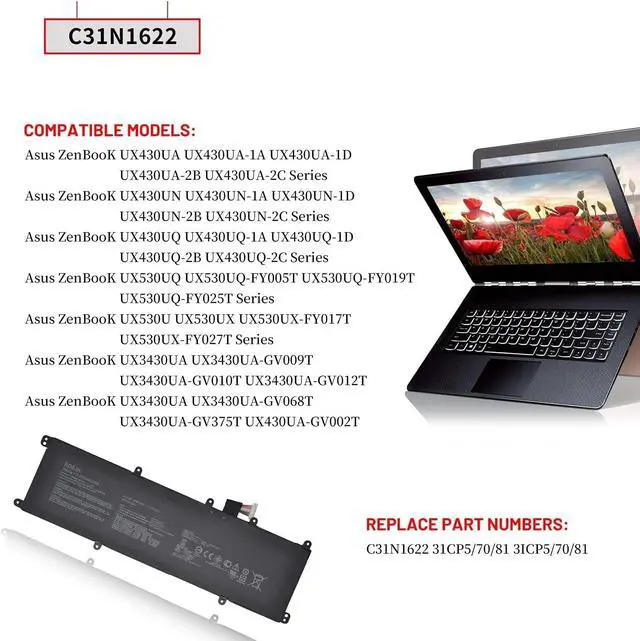 C31N1622 Batería de Repuesto para computadora portátil Compatible for Asus ZenBooK UX3430UA UX530UQ UX530UX UX430UA UX430UN UX430UQ UX430UA-1A UX430UA-2B UX430UN-1D Series 31CP5/70/81 11.55V 50Wh