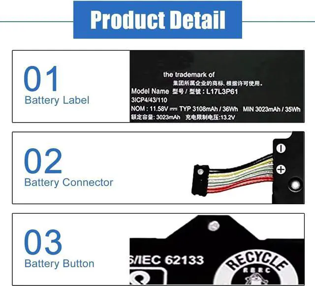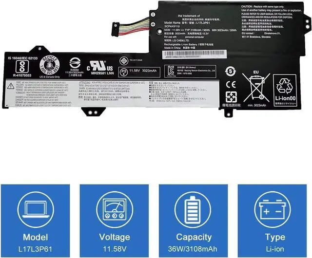 L17L3P61 Batería de Repuesto para computadora portátil Compatible for Lenovo Ideapad Yoga 720-12IKB 330-11IGM 320S-13IKB 6-11IGM 7000-13 L17M3P61 L17C3P61 11.58V 36W/3108mAh 3Cells