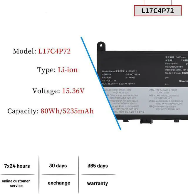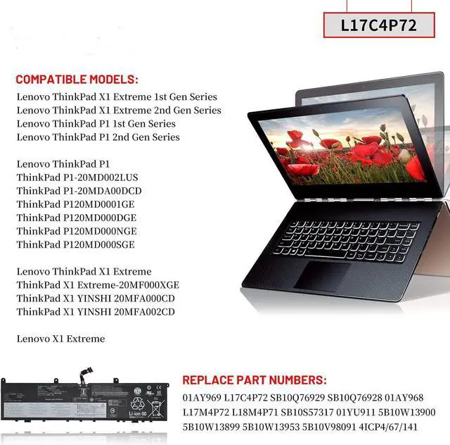 L17C4P72 L17L4P72 L17M4P72 Batería para portátil Compatível com ThinkPad P1 X1 Extreme X1E Series 01AY968 01AY969 L18M4P71 SB10S57317 01YU911 SB10Q76928 SB10Q76929 4ICP4/67/141 15.36V 80Wh