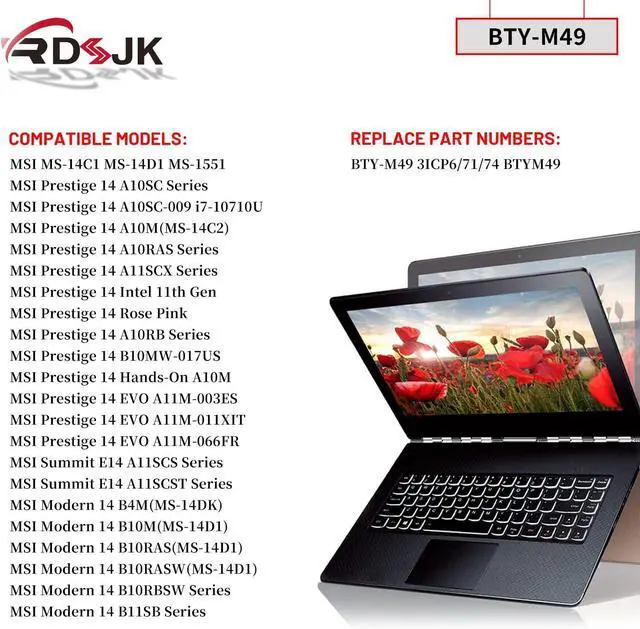 Compatible Models: MSI MS-14C1 MS-14D1 MS-1551; MSI Prestige 14 A10SC Series A10SC-009 i7-10710U; MSI Prestige 14 A10M(MS-14C2); MSI Prestige 14 A10RAS A10RAS-068AU A10RAS-078IT A10RAS-079 A10RAS-098CH Series; MSI Prestige 14 A11SCX A11SCX-060ES A11SCX-091 A11SCX-205 Series; MSI Prestige 14 Intel 11th Gen; MSI Prestige 14 Rose Pink; MSI Prestige 14 A10RB Series; MSI Prestige 14 B10MW B10MW-017US; MSI Prestige 14 Hands-On A10M; MSI Prestige 14 EVO A11M-003ES A11M-011XIT A11M-066FR Series